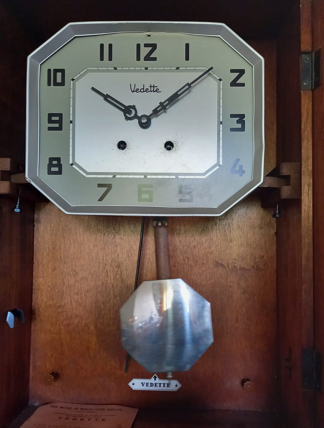Donc comme le disent mes collègues il faut visser la vis sous le balancier de 1/2tour et attendre deux ou trois jours pour voir le résultat. En remontant le balancier la pendule va accélérer et le contraire si vous dévissez.